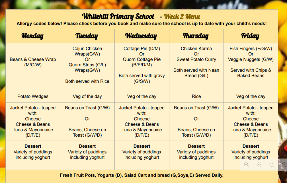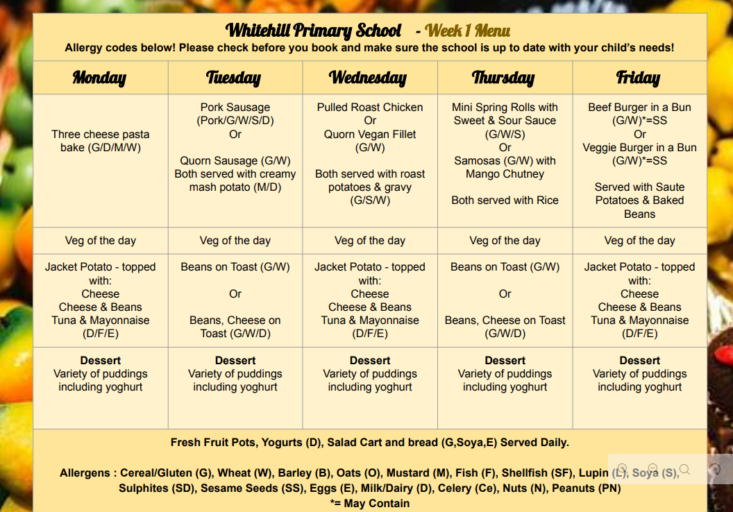 potatoes, pasta, rice), vitamins and minerals for a healthy immune system and organ function (fruit and vegetables) and a source of dietary fibre (fruit and vegetables and salad). All our kitchen team meet the requirements of health and safety, and all of the ingredients bought into the kitchen are checked for suitability in relation to allergens. School lunches can be booked and paid through Arbor.