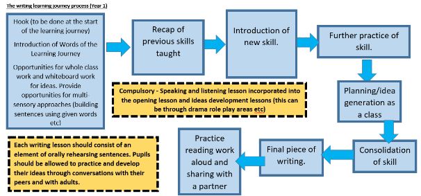 Lessons will be broken down into learning journeys that will take place over roughly a 2 week period. In year 1, each task will be focused on 1 skill which will be embedded over the period of lessons. Teachers will place a huge focus on oral rehearsal on written sentences before moving on to writing sentences down. Pupils will then be given time to re-read their work and discuss it before moving on. Where possible, teachers will use a multi-sensory approach to the teaching of writing in order to support students with learning difficulties. This may include but is not limited to: hands on sentence building activities, writing sentences in the air whilst saying them, vocalising their words as they write, writing words being repeated by another pupil/adult and discussion about all aspects of sentence work.